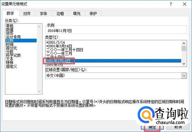 弹出的界面,我们就可以看到很多日期的格式了,我们点击其中一个,然后点击确定;