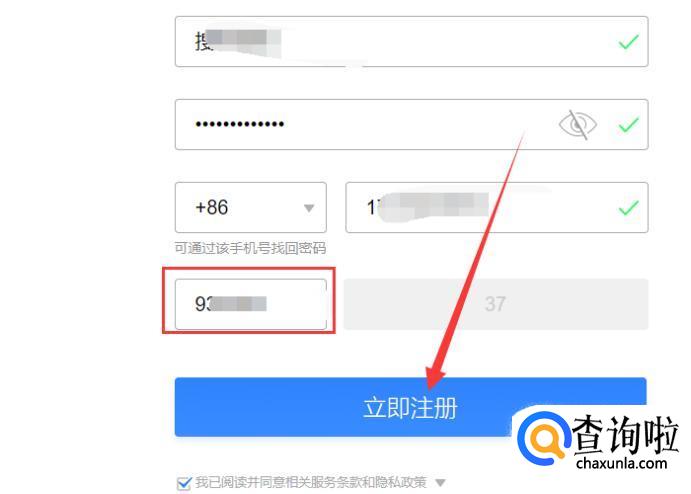 收到验证码之后,填写在图示位置,点击“立即注册”即可。