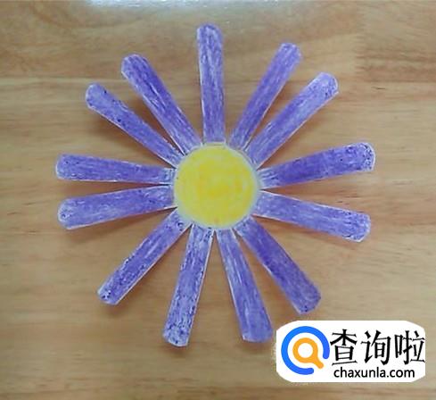最后,用彩笔将压好的太阳花涂好颜色,再找一个细木条用双面胶粘在太阳花的背面,这样就完成了。