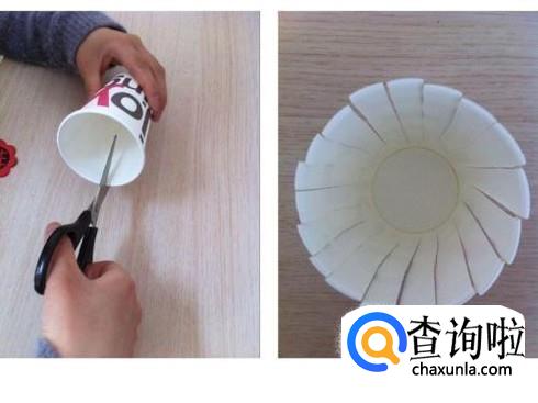用剪刀沿着做在杯子上的印记,从开口处,一直剪到底部。开口距离杯子的底部最好在一厘米左右。