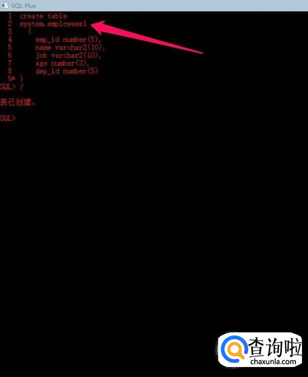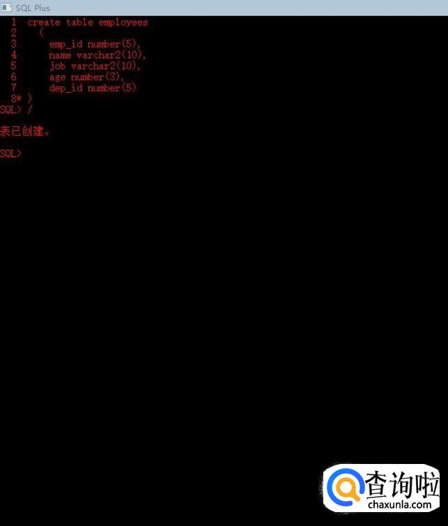 首先用户必须要有CREATE TABLE系统权限,并且只能在自己的模式中创建表,图中的例子使用CREATE TABLE语句在当前模式中创建了一个共有5列的表:表的名称为employees,包含 emp_id, name, job,age,dep_id 等5列,后面的number、 varchar2、等为数据类型,括号里面为长度。