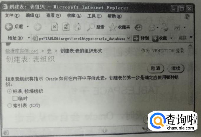 系统进入管理表界面,在该页面中单击【创建】按钮,进入如图所示的“创建表的组织形式”界面。在该界面中用户可以选择创建的表类型---标准表、临时表或索引表。