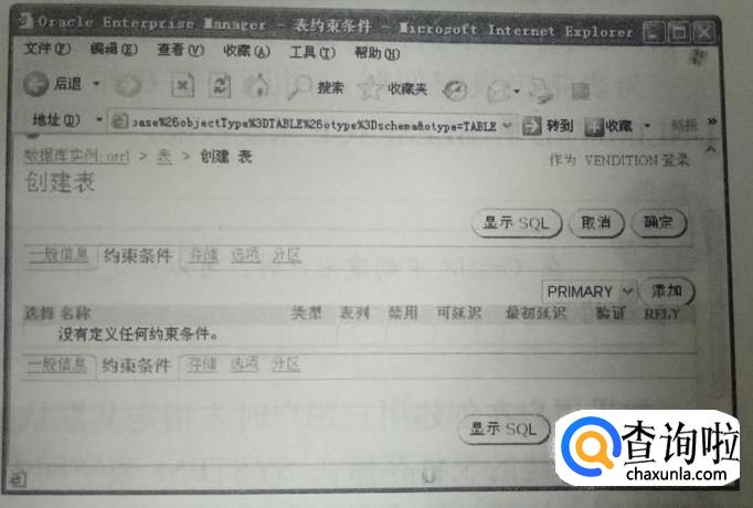 在“创建表”页面中选择“约束条件”选项卡,进入如图所示的“表约束条件”页面。该页面中用户可以为创建的表定义约束条件,包括主键约束(PRIMARY)、唯一约束(UNIQUE)、检查约束(CHECK)和外键(FOREIGN)约束。