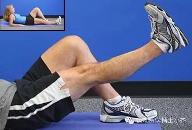 腿部尽量伸直,用力保持大腿肌肉绷紧,5秒后放松。重复10次后换另一条腿。