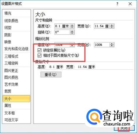 弹出的界面,我们将锁定纵横比和相对于图片原始尺寸均勾选上,之后我们点击关闭就可以了,这样就固定图片了。