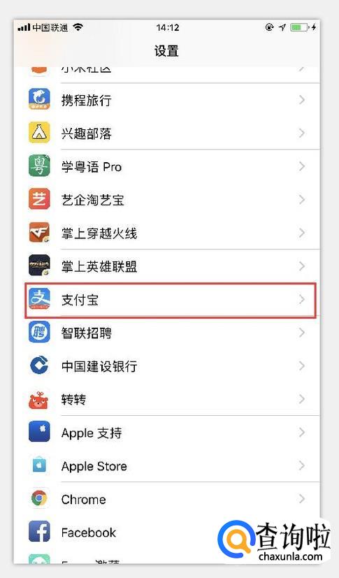 进入设置之后,往下滑动,找到支付宝APP,点击进入。