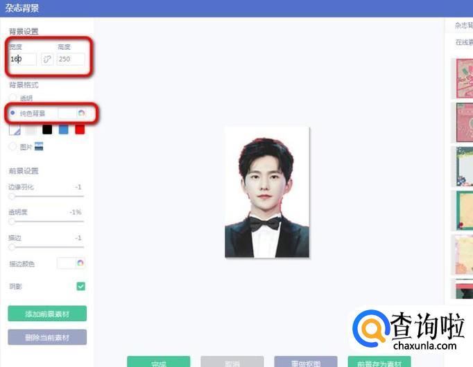 点击杂志背景色的背景格式切换为白色的纯色背景,再将背景设置的宽度和高度设置成合适的尺寸,即完成了照片背景换成白色的操作。