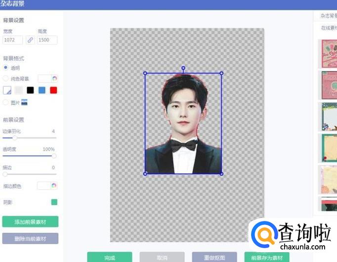 点击完成抠图后,如图进入杂志背景界面,当前的图片是无背景色的。