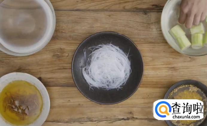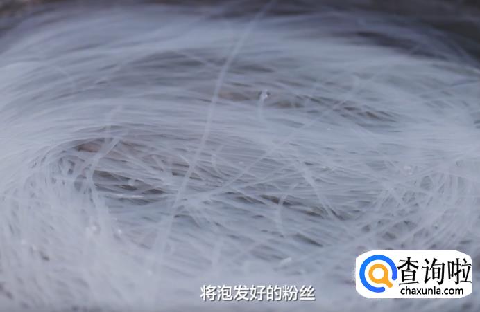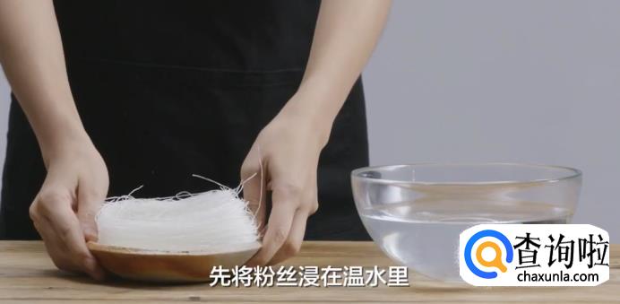 将泡发好的粉丝沥干水分后,用剪刀适当剪断,铺在碗底。