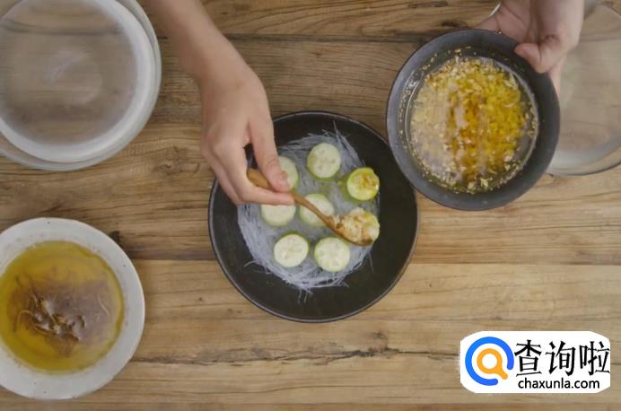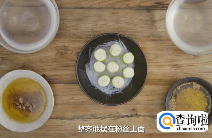 丝瓜块从盐水中取出来挤干水分,整齐的摆在粉丝上面。