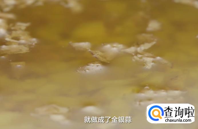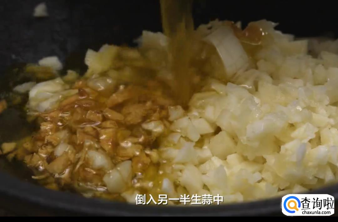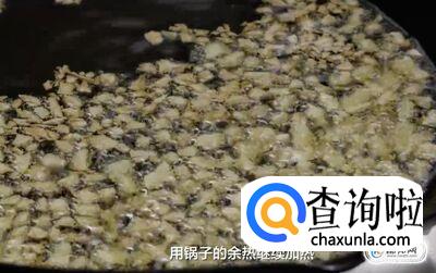 接着炸金银蒜:热锅起油,烧至五成热时,将切好的蒜末取一半放入锅中;炸到开始变金黄色的时候关火,用锅子的余热继续加热。