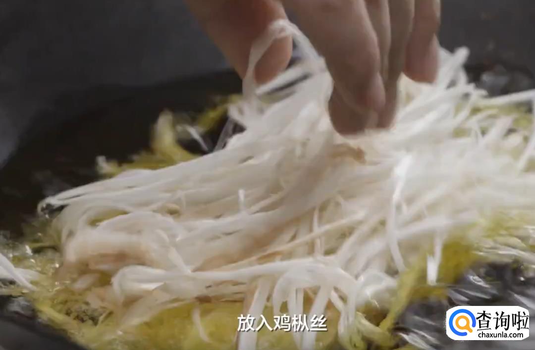 放入鸡枞丝,用大火把菌丝里面的水分逼出来后,调微火。
