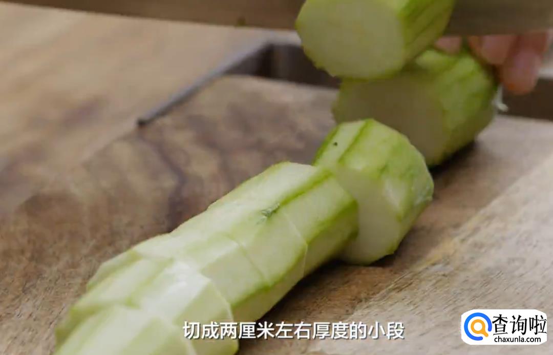 丝瓜去皮后,切成两厘米左右厚度的小段。