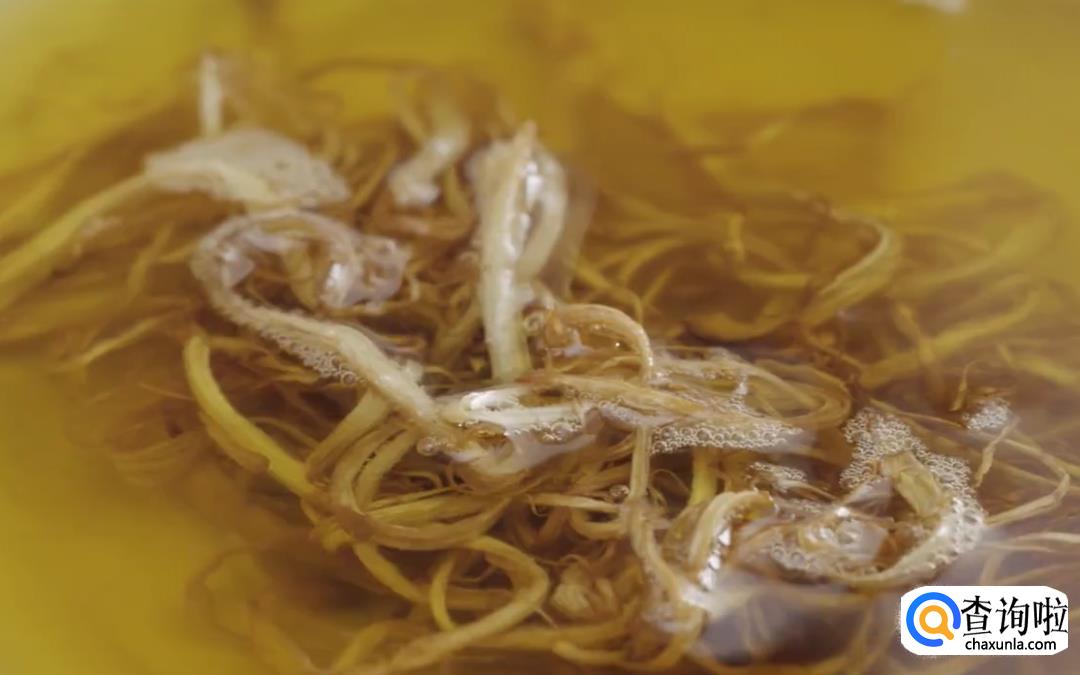 处理鸡枞:先用小刷子刮去鸡枞表面的泥土,用流水快速冲洗干净,再撕成丝。