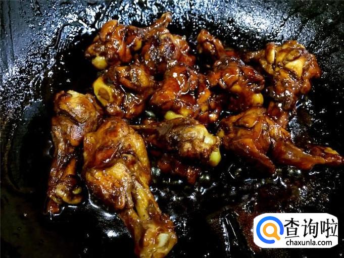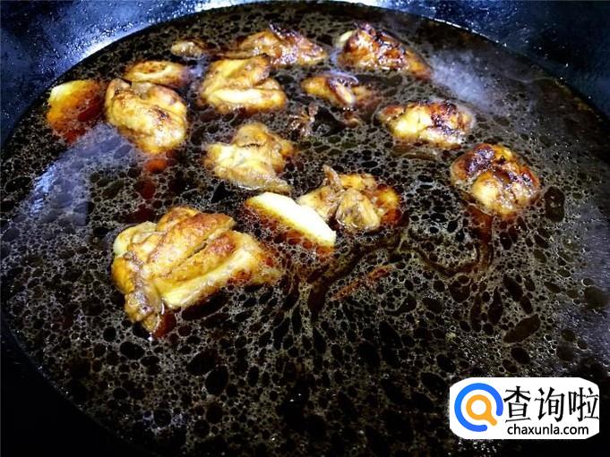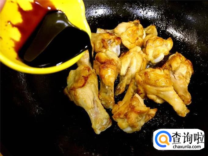 小鸡腿的两面微黄的时候,倒入老抽翻炒几下。