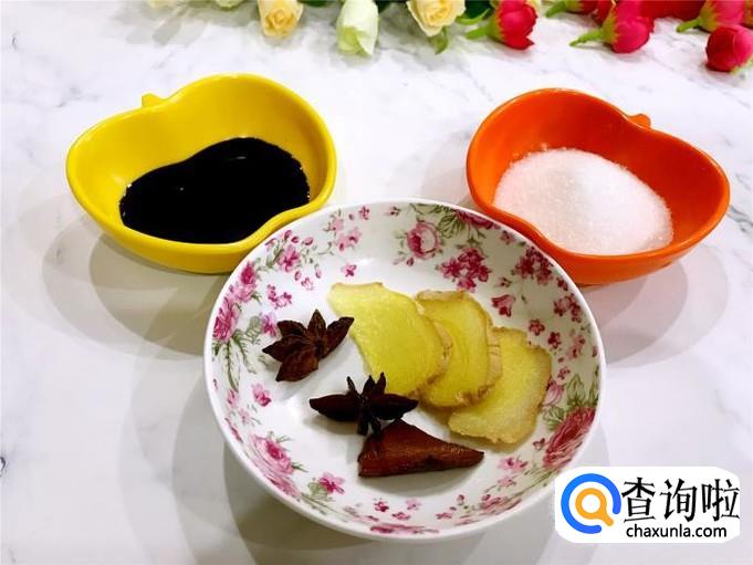 提前准备好辅料,分别有姜,八角,桂皮,白糖。