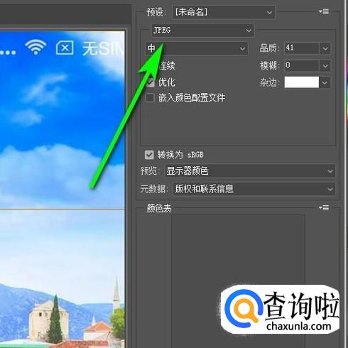 在面板的右上方这里,设置格式为长图的原来格式,比如,JPEG;再点储存