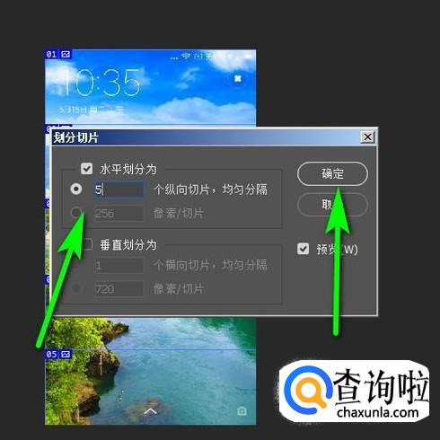 弹出面板,勾选水平划分为;再设置其参数为:5;再点确定。
