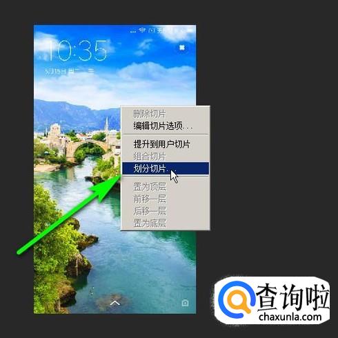 比如,要把长图水平平均切成5张图片;那么,调出切片工具后,鼠标放在长图上,再右击,弹出菜单再点:划分切片