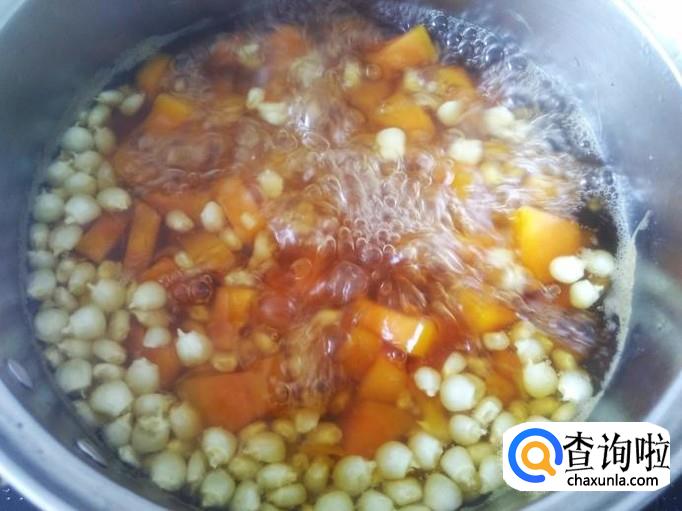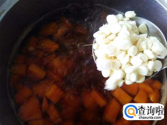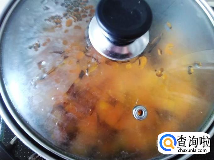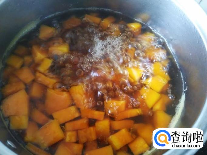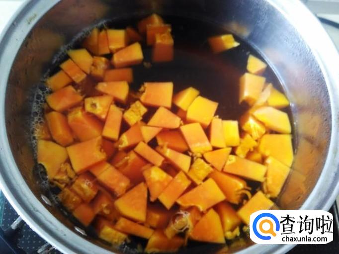 再放木瓜丁进去,盖上盖子煮5分钟左右。