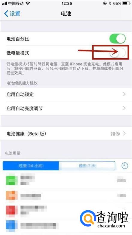 接着点击开启低电量模式开关,下图所示。