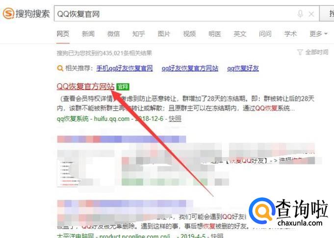 在搜狗搜索引擎搜索“QQ恢复官网”,点击并进入,如图所示。