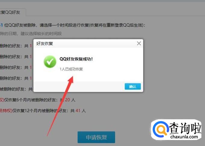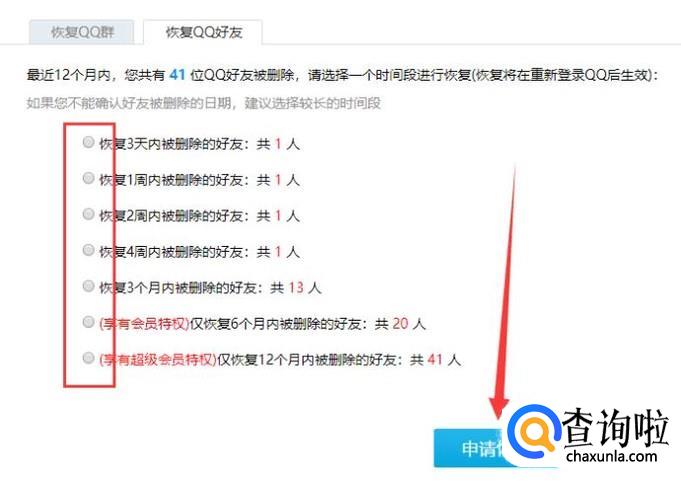 进入之后,根据删除好友的时间选择时间段进行恢复,点击“申请恢复”。