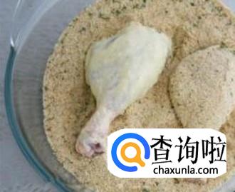 将鸡腿放入搅拌好的面粉酱里,使整个鸡蛋都沾上面粉酱后再拿出,拿出后放到面包屑里裹上面包屑。