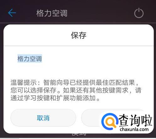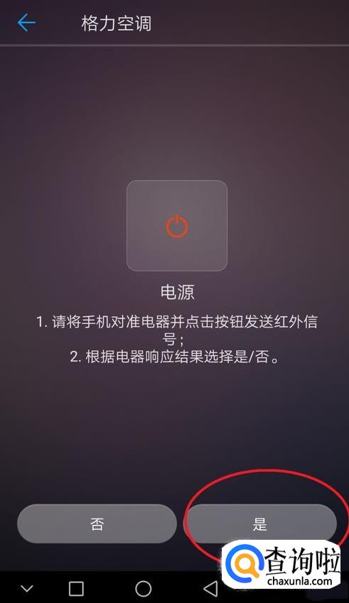 此处以添加格力空调为例,选择空调——格力,然后将手机对准空调并点击界面下侧的“是”(可适当按住不放2秒钟),然后即可配对成功,出现图片所示的界面,点击“确定”后,即可使用。