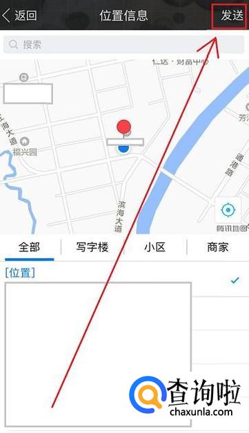 在位置信息界面的下方选择自己附近容易辨别的位置信息后,点击右上角的“发送”按钮,即可成功将自己的位置发送到QQ群中。