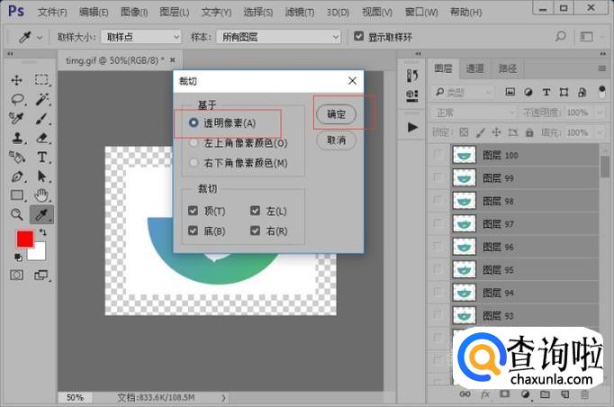 接着我们执行图像-裁切命令。在裁切的时候,我们选择透明像素。