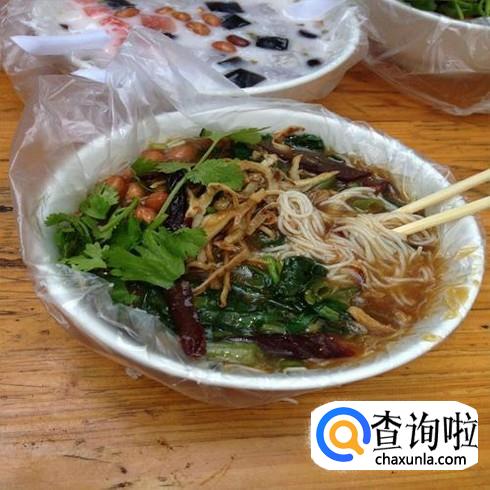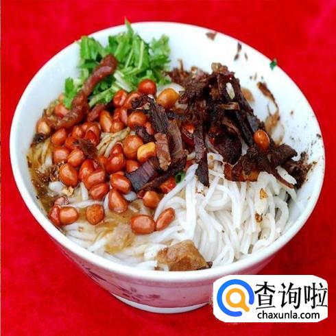 将米粉烫熟后倒入碗里,再在碗里加入煮熟的黑豆芽、牛肉丝、炸鱿鱼丝、油炸花生米、炒芝麻仁末、脆炸面片、碎香菜 、竹笋及酸菜等配料,再加入花生油、老抽等佐料,一起搅拌,吃起来满口留香,特别爽。