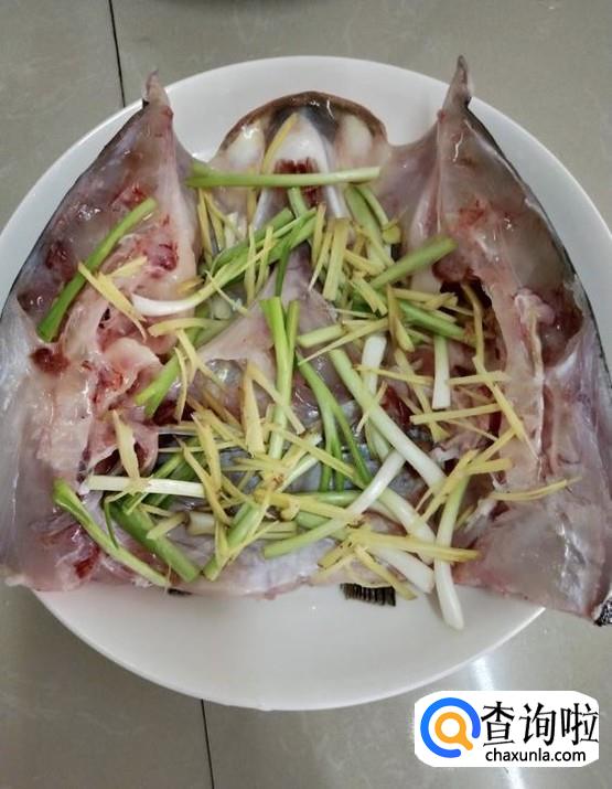 鱼头加盐搓洗干净,冲掉盐水,将鱼头翻放在盘中,撒上胡椒粉,少许盐,适量料酒腌制