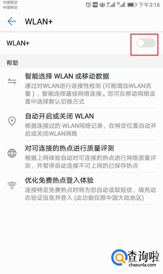 弹出的界面,我们将WLAN+的开关向左滑动关闭就可以了,这样就不会自动连接wifi了。