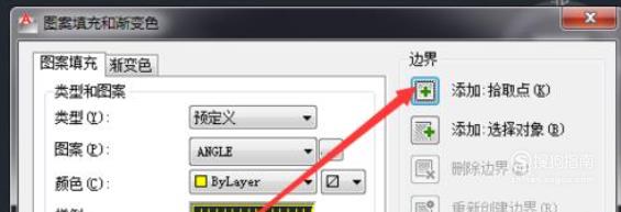 输入H命令(图案填充),按回车键,打开图案填充对话框,单击“添加:拾取点”。