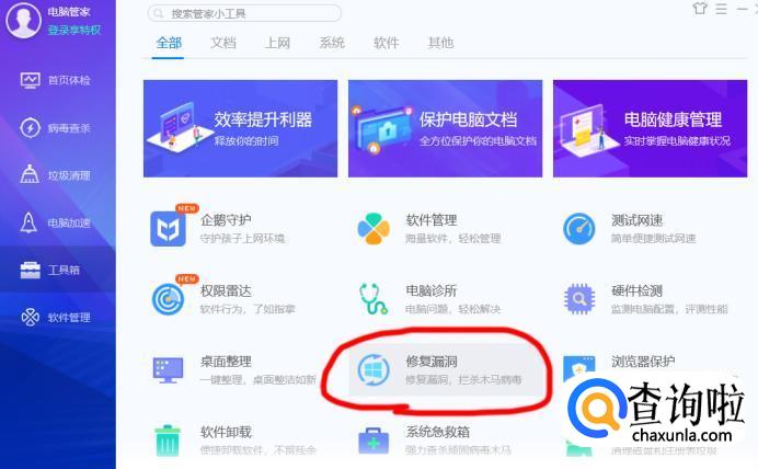 在工具箱中找到修复漏洞,点击修复。