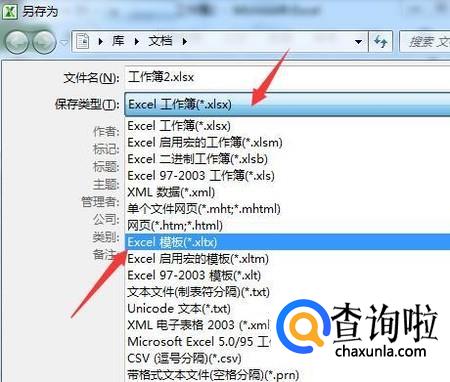 在保存对话框中点击保存类型,选择Excel模板,点击保存。