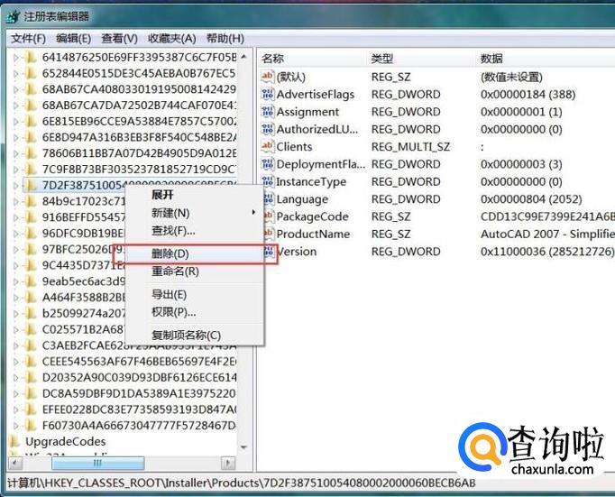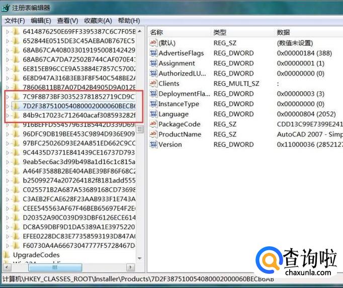 接下来,可以看到名为“7D2F387510054080002000060BECB6AB”的子项目录,双击打开该子项可以看到其中包含了CAD软件的安装信息。