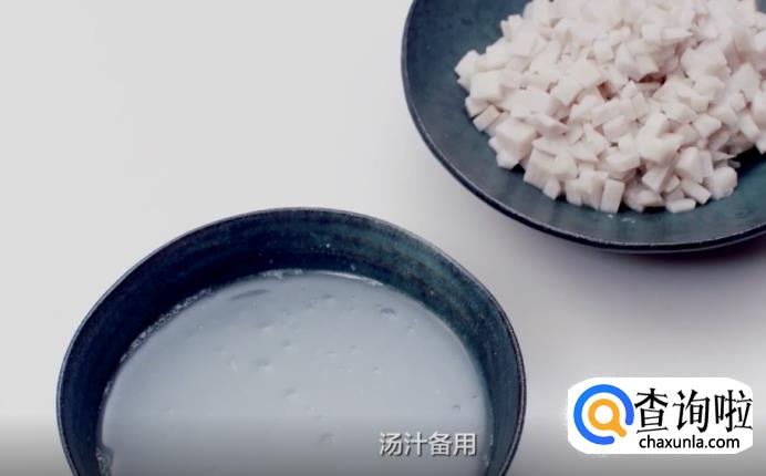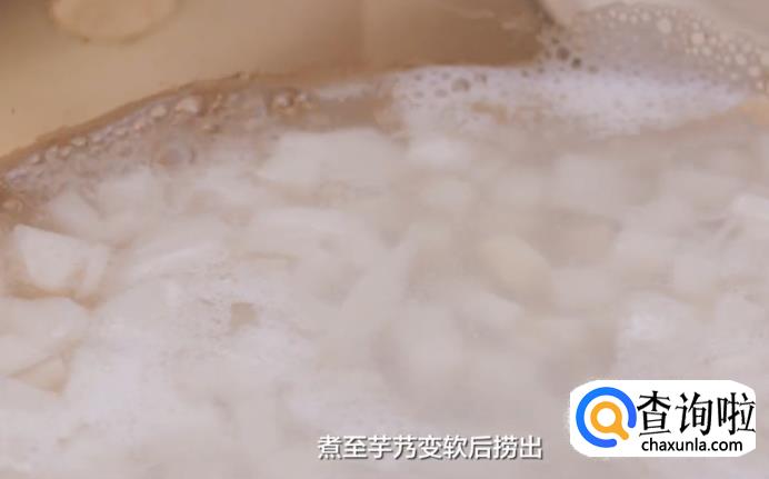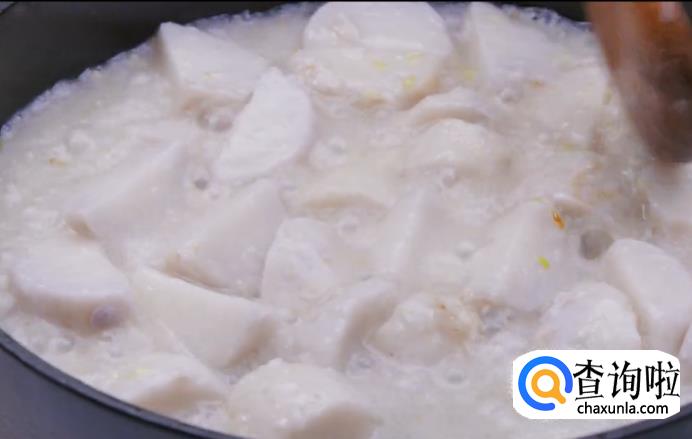 接着煮芋艿,把芋艿放入锅中,倒入冷水,大火煮开后转小火,煮至芋艿变软后捞出,汤汁留着备用。