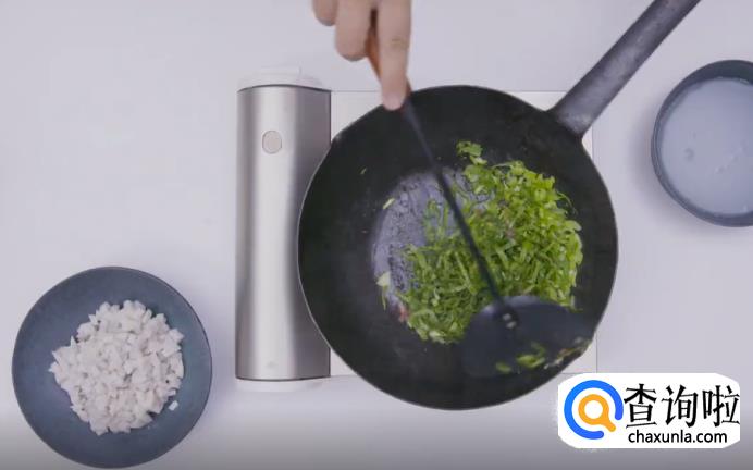 然后,热锅起油,先放火腿煸炒出油,再加入青菜,炒至五分熟,接着放入芋艿和煮芋艿的汤汁,可以根据自己喜欢的浓稠度来调整汤汁的比重。