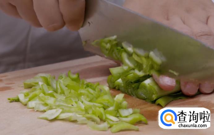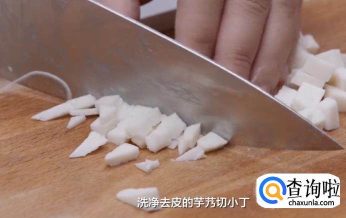 首先来备料。将焯过水的火腿切丁,小青菜切碎,洗净去皮的芋艿切小丁。