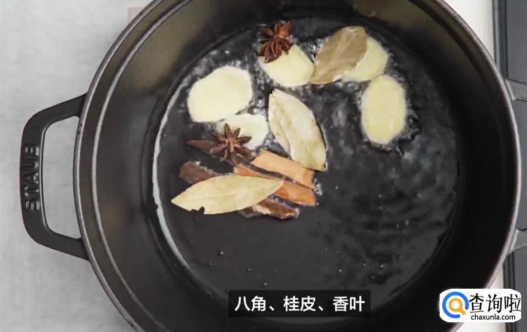 热锅起油后,放入八角、桂皮和香叶,小火翻炒出香味。
