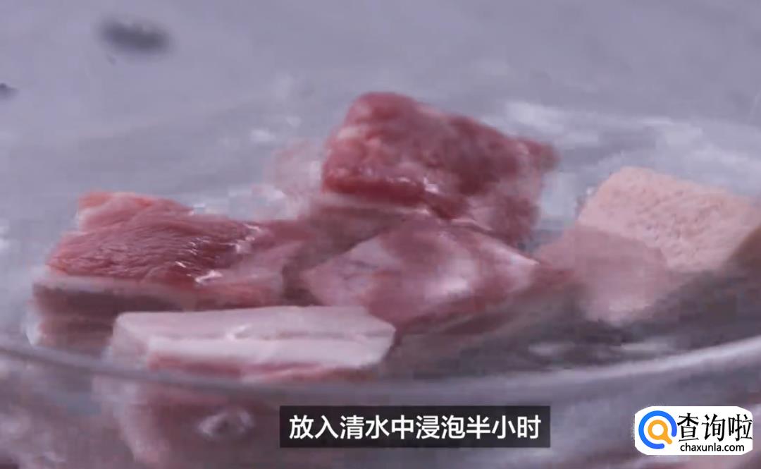 将五花肉切成3厘米左右的大块,然后放入冷水中浸泡30分钟。