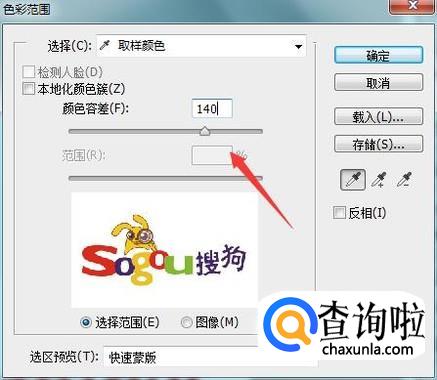 点击色彩范围选项使用吸管工具吸取背景色,然后设置颜色容差值如图所示: