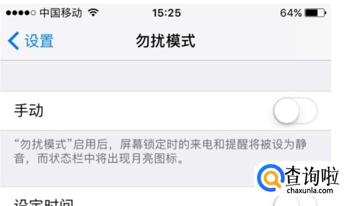 进入到勿扰模式的设置界面,可以看到第一个列表就是手动,在其后边有个开关,此时处于关闭的状态,也就是月亮图标无法显示,(月亮图标就是勿扰模式,整个手机处于静音的状态)