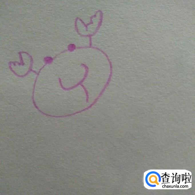 接下来,在两眼睛的中下部画一根向上凹的弧线然后再这根弧线下方画一根斜向下方的弧线,作为嘴巴
