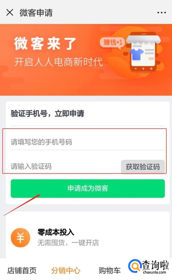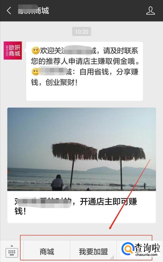 关注成功后,就到了申请成为微商城客户的步骤了,以这个商城的菜单栏为例(其他的商城操作大同小异),点击“我要加盟”,根据提示填写完善信息即可;另外一种申请方式是,通过朋友分享的链接,关注后进行对应的申请操作。