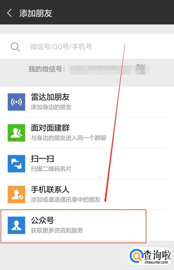 打开微信右上角的“添加朋友”,选择“公众号”