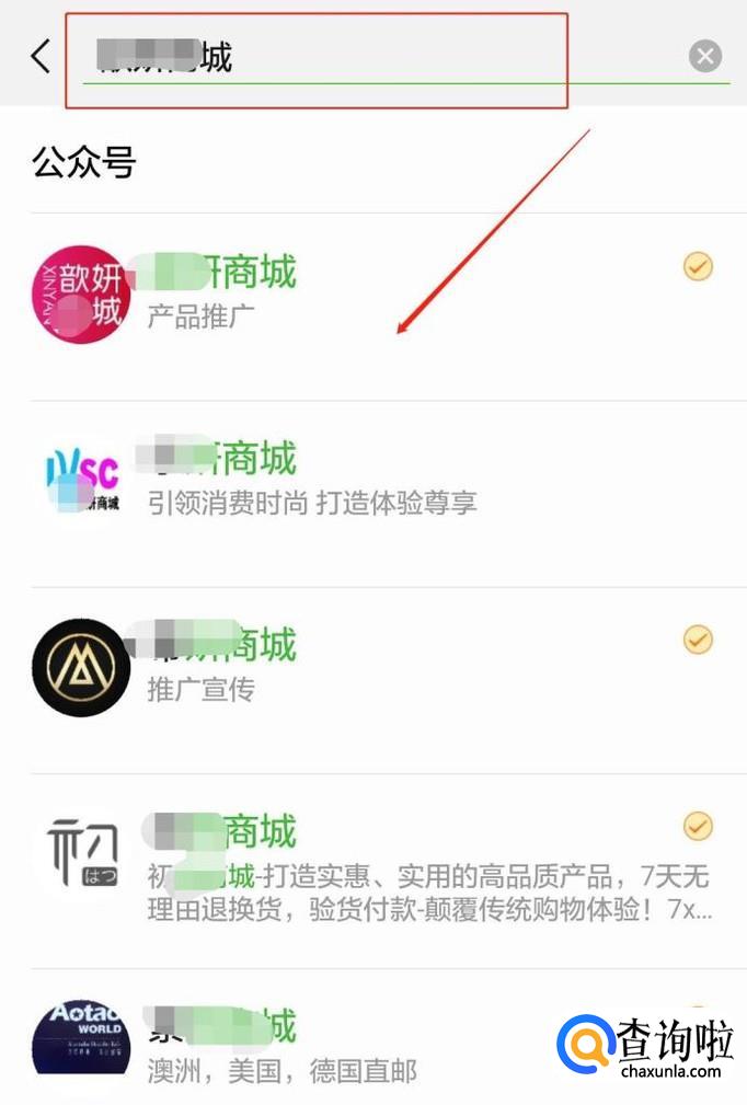 在“搜索栏”填写要关注的公众号,譬如“歆X商城”