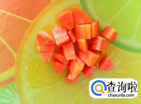 先准备食材,把虾仁处理干净,然后胡萝卜切成小块状。